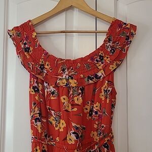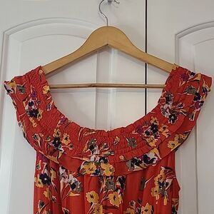 This is a gorgeous colloquial dress that can be worn off the shoulder or more as a sleeveless tank style dress. Designed with a bit of whimsy and a whole lot of charm, this beautiful red floral midi dress is perfect for spring and summer.