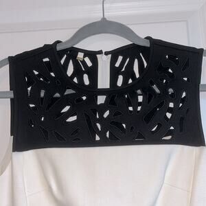 Anthropologie 4C 4. Collective Black and Ivory Fit and Flare Dress, size 8. Black crochet/lace yoke with solid ivory bodice and skirt. Sleeveless, fit and flare style, stretchy fabric, back zip.