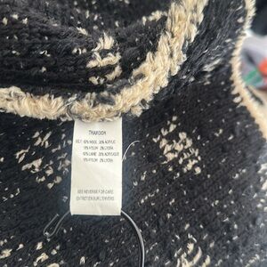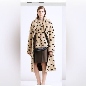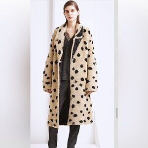 Anthropologie by Thakoon Panichgul The garment in the image is identified as the Numph Nuflotta sweater jacket, featuring a beige base with black polka dots button down closure with hidden pockets . Size S
