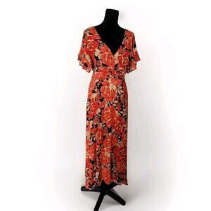 Anthropologie Abel The Label Vivid Dreams Bright Red Floral Maxi Dress Boho is a beautiful and vibrant dress made of lightweight rayon material. It features a flattering V-neckline, short flutter sleeves, and a ruffle accent. The dress has a long length and is belted and smocked at the waist . It is perfect for various occasions, including weddings, parties, and casual events.