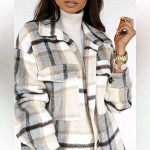 Designed in a chic neutral check with lapel collar, button front, and flap chest pockets. Lightweight but cozy — perfect for layering over jeans, leggings, or dresses. A versatile shacket style that works for everyday wear, travel, or casual nights out. BNWOT