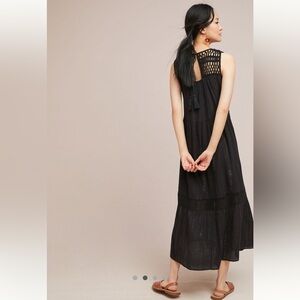 This stunning black sundress by Anthropologie features a tiered silhouette, perfect for a wedding guest or cocktail event. The sleeveless design and flowing fabric offer a graceful and sophisticated look, while the monochromatic color adds a touch of elegance.