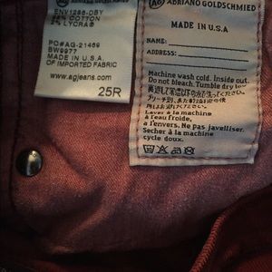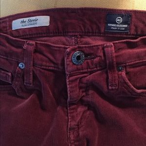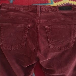Here we have one of my favourite skinny cords. Anthropologie Adriano Goldschmied skinny cords 25r the first photo is to show fit. The color is burgundy as shown in the actual photos of my cords. I am now a 26r, so my loss is your gain. Great condition, no holes, rips or worn patches. Smoke free kitty friendly home. 😻😻 thanks 4 Looking!