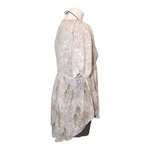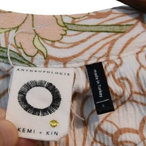 This Anthropologie Akemi + Kin blouse captures soft bohemian artistry with a unique art nouveau-inspired floral print in earthy peach, tan, and sage tones. Made in Turkey from lightweight textured cotton, it features a relaxed silhouette with gentle gathers, a button-front closure, and short sleeves finished with subtle elastic cuffs. The flowy cut drapes beautifully for an easy, romantic fit. Size Small.