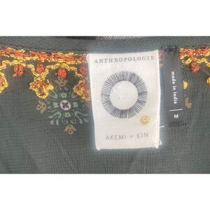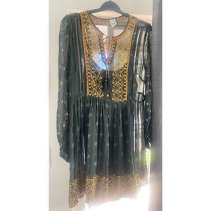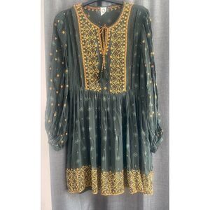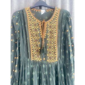 Beautiful dark green dress with fun pattern plus orange & gold embroidery florals at yolk with tassel tie, around neck, around back yolk, on sleeves and at hem. Only worn a couple tmes.