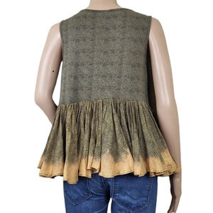 Dark green, brown, and tan colored geometric mosaic printed top from the brand Akemi & Kin sol at Anthropologie. Features a sequined beaded detail, a mild dip dye at the hem, and a peplum flare for a flattering fit. In the style “Anaphora”.