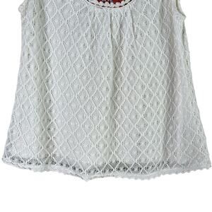 Features: round neckline, floral embroidered panel at neckline, sleeveless, relaxed fit, lace material, lined. Color: white/cream with multi color embroidered panel.