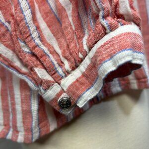 long sleeve blouse with red stripes and white tassels that tie at the neckline. Elastic at sleeve cuffs.