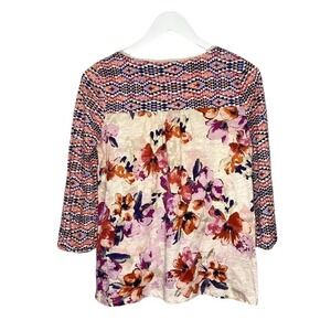 Mixed multicolor print top with floral pattern on body and geometric pattern on sleeves and shoulders