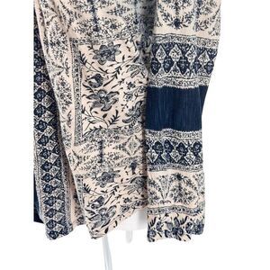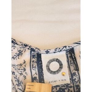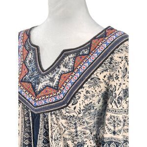 Embrace bohemian elegance with this stunning Akemi + Kin tunic top! This long-sleeve blouse features a beautiful cream base with intricate black paisley and floral patterns, accented by bold navy blue panels. The deep V-neckline is adorned with vibrant, multicolored embroidery in shades of red, blue, and orange, adding a touch of artisanal charm. The gathered waist creates a flattering silhouette, while the lightweight fabric ensures all-day comfort. Perfect for a festival, casual outing, or layering with your favorite jacket.