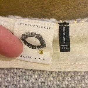 Anthropologie Akemi & Kin Foil Print Pointelle Pullover Cream & Gold Sweater Size XXS. Preowned. Gently worn. Underarm to underarm measures approx 16.75” across. Mid-shoulder to hem measures approx 20” long.