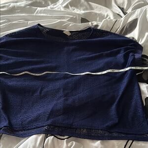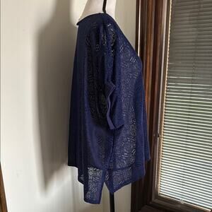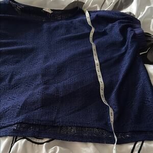 Elegant navy blue lace blouse. Features intricate patterns. Perfect for casual or formal wear. Has elastic cuff sleeves. Oversized, in great used condition, no flaws or damage to note.