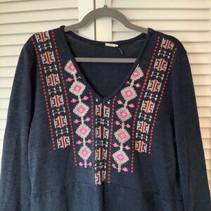 Anthropologie women's Akemi + Kin Savin tunic sweater, size XL. Navy blue with pink/silver/other colored embroidered at neck. V-neck. High slits on each side. High low hem. Great boho look.
