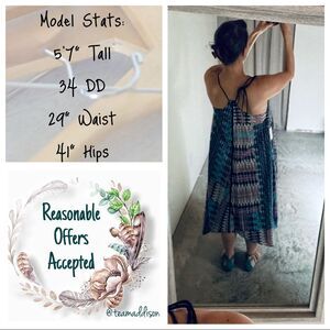 MSRP: $118 NEW “Riviera” printed tassel Midi Dress by Akemi + Kin from Antheopologie . Flowy handkerchief hem:loose fit. Spaghetti style racerback straps can be adjusted to create a perfect fit. Material: 100% cotton. Lining: 100% Rayon. This fabric is so Flowy + adjustable straps make getting accurate measurements difficult. It fits me nicely: please see my personal measurements in photo section. Note: belt not included.