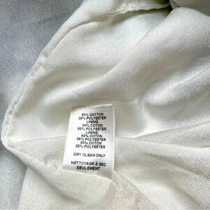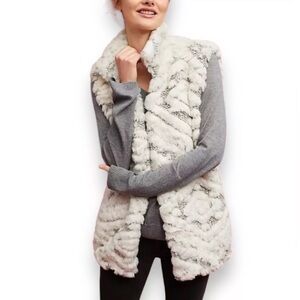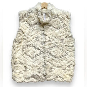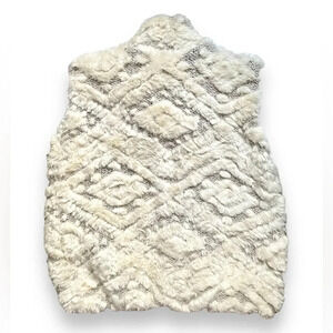 A creamy white faux fur textured vest with open front, collar, and pockets. Fully lined. Cotton and polyester shell and lining. Made in the U.S.A.