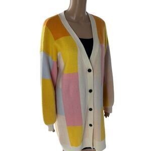 Anthropologie Amadi Lexie Colorblock Cardigan sweater. Colorblock details in Pink, white, yellow, orange, and blue. Functional buttons up the front, looks great worn buttoned or open. Long sleeves. V neck. Ribbed details at the cuffs and hem. Acrylic, nylon, polyester. Hand wash. In preowned condition.