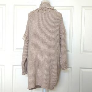 Anthropologie Amanza Fringed Cardigan Sweater. With an oversized fit and playful fringe embellishments, this cardigan is an irresistibly cozy layer for the season. Taupe, beige tone. Polyester, acrylic, wool, alpaca wool. Fringed embellishment. Side seam pockets. Open front.