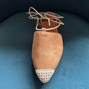 Never worn. Fashionable flat with ankle tie. Bought from Anthropologie. Slender fit.