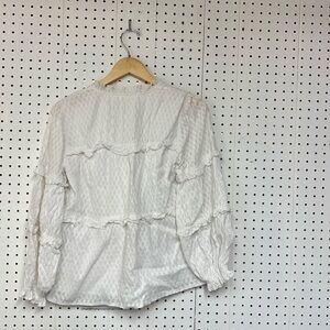 This white blouse from Anthropologie features a relaxed fit with charming ruffled details and a classic peter pan collar. Its airy fabric and elegant design make it a versatile addition to any wardrobe, perfect for both casual and formal occasions.