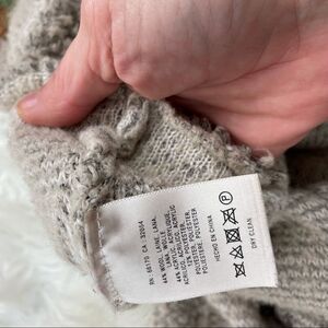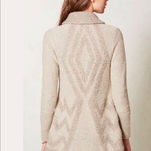 Anthropologie Angel of the North Equinox cardigan size x-small. Tan and cream wool/acrylic/polyester blend material. bouclé accents and diamond/Chevron design on the back. Drapes open front and long sleeves. No holes, light discoloration on inside of back collar. Can’t be seen when worn.