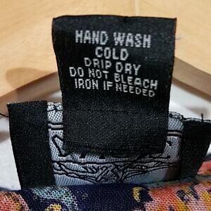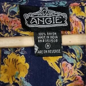 Cape style rayon floral top... Beautiful! Gently pre-owned. Cinches with a tie at waist. Navy blue, yellows, pinks.