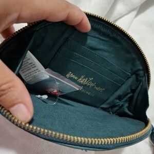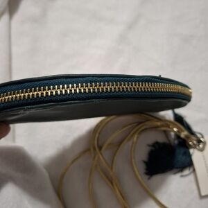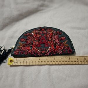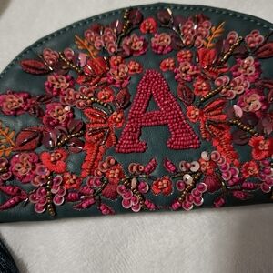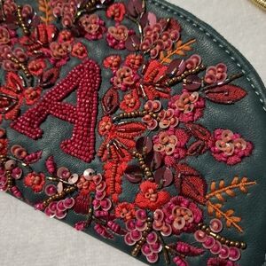 This Anthropologie Anna Harlow Russo Monogram L Clutch is a small crescent-shaped clutch bag in a beautiful green leather exterior with intricate beaded and sequin accents. It features a zip closure with gold hardware, a lined interior with credit card slots, and a zip-around design for easy access. The bag is part of the Anna Harlow Russo collection and includes a pouch accessory. Perfect for travel, weddings, parties, or formal events, this unique clutch exudes a bohemian and flower-themed style with a touch of elegance.