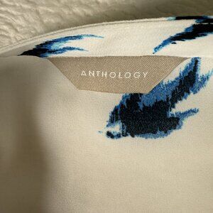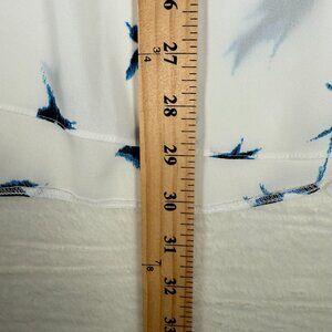 The Anthropologie Anthology Sheer Blouse with Birds and Roll Tab Sleeves is a stylish and casual top perfect for women size 26. This V-neck blouse features a beautiful bird pattern on a white background, with roll tab sleeves adding a unique touch. Made of polyester, this blouse from the Anthology brand offers a regular fit and is ideal for everyday wear. Its sheer material adds a touch of elegance, making it a versatile piece in any woman's wardrobe.