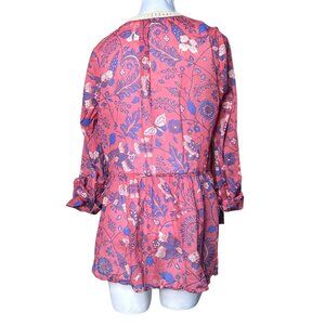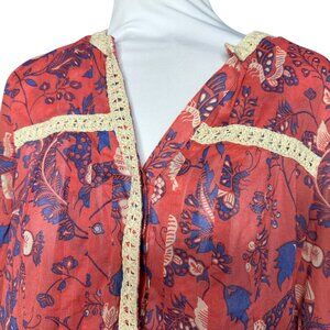 Grogeous dark salmon top with blue and cream floral and feather pattern. Cream crochet accent. Quarter b utton up. semi sheer.