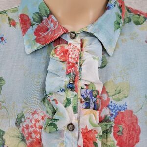 Embrace elegance with this floral ruffle button-up blouse. Featuring a beautiful blend of blue, red, and green hues, this top is perfect for any occasion. The delicate ruffles add a touch of femininity to your wardrobe.