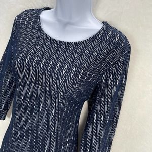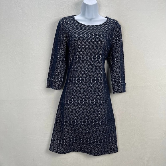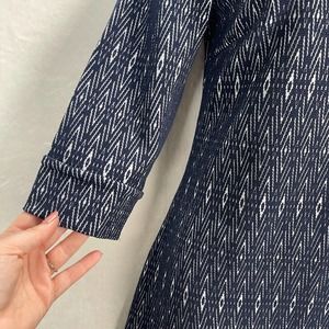 Anthropologie Aryeh Black and White Sheath Dress, with Geometric Pattern, ¾ Sleeves that are cuffed for extra detail. Textured Stretch Knit Material. Machine Washable