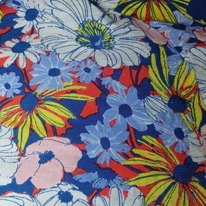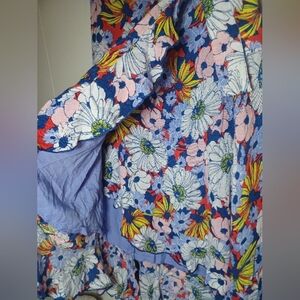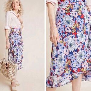 This Anthropologie skirt features a striking asymmetrical design in bold red and yellow hues, perfect for resort wear. Its pencil silhouette offers a sleek and modern look, ideal for casual outings. The vibrant colors and unique cut make it a standout piece for any warm-weather wardrobe.
