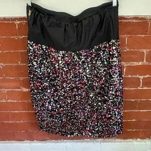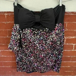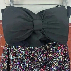 Fabulous cocktail dress in a women’s 16. Multi colored sequins with a tulip wrap front. Strapless with a heart shaped neckline accentuated with a big black bow. Never worn, new with tags condition. Super!
