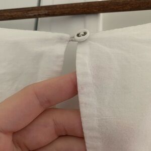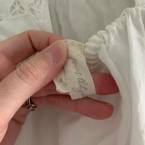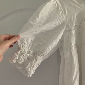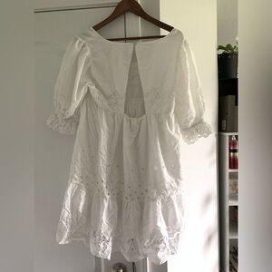 Chic white dress featuring eyelet details and puff sleeves. Perfect for a stylish look.