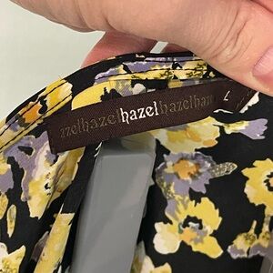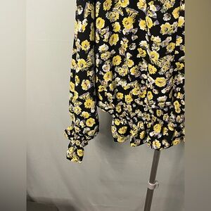Azelhazel floral top Size Large long sleeves Gartered gathering on waist and at end of sleeve, Scoop neck front and back Black with yellow flowers