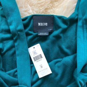 Modal, poly and spandex. Slim midi silhouette. Pullover styling. Hand wash. Blue & Green/aqua color. Side slits.
