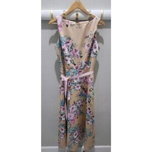Tags: Formal, wedding guest, bridesmaid, floral, sleeveless, boat neck, lined, church, belted, stylish.