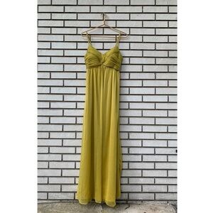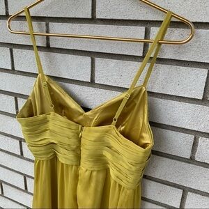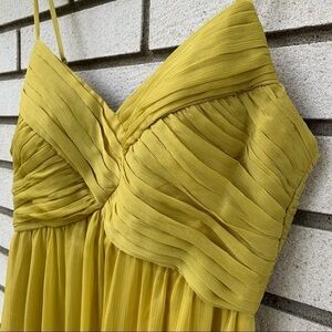 A shirred bodice with a gentle v-neck and empire waist top a flowing maxi skirt; this crinkled chiffon dress is finished with thin adjustable straps and a low back. By BHLDN. Back zip. Polyester; poly-spandex lining. Gold, mustard, marigold color. Size S. Great used condition, please see photos.