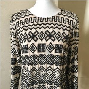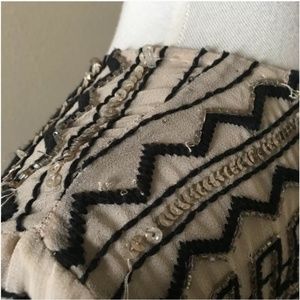 Gorgeous beaded and embroidered dress features champagne fabrication with black and champagne/gold stitching and beading. Good condition. This dress has many beads but still manages to look cooly casual and bohemian at the same time. Great with flats or pumps. Please note that dress has some flaws but is in overall very good condition. Dress is missing some beads & sequins in various places, has some loose threads and some very small holes in netting. Overall these aren’t extremely noticeable due to the huge amount of embellishment.