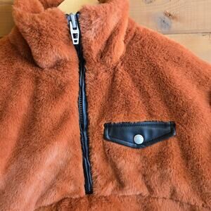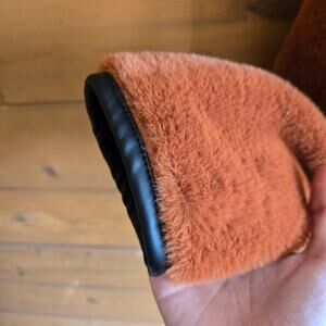 Color is like a pretty brownish orange tone, perfect for fall. Faux leather details, the outside is so soft and fluffy with a mesh style inside. Adjustable cords on the bottom to be worn loose or tightened. Minimal hard wear wear, overall great condition.
