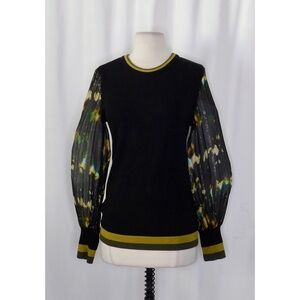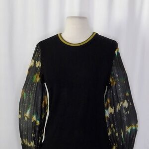Rounded neckline ~ Long sleeves ~ Straight hemline ~ Pullover styling … no closures ~ Mixed fabrics … body & sleeve cuffs are a knit fabric … sleeves are an airy chiffon fabric ~ Knit parts are a solid black with two-toned green stripes on the neckline, sleeve cuffs and waistband ~ Sleeves are an abstract or watercolor print in shades of black, orange, ivory, green & aqua with gold metallic stripes running through the print