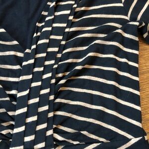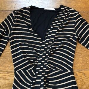 Uber-flattering bodycon dress in versatile black and tan Jersey stripes by contemporary favorite Bailey 44 for Anthropologie. The Confluence Dress features subtly sexy asymmetrical ruching along the neckline that continues down to the hem. Chic three-quarter sleeves exude a confident femininity. Pair with pumps for the office, or wear with strappy heels for a date night look! Excellent condition with no known flaws. Size XS.