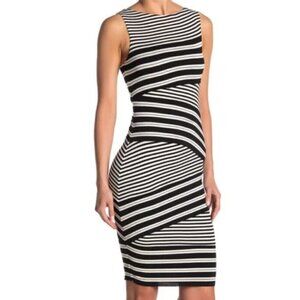 Anthropologie Bailey 44 Striped Column Dress, Annabelle style, in black with gold stripes. The stripe variation may differ slightly from the stock photo, which is included to show fit details. The material is very stretchy and comfortable for all-day wear.