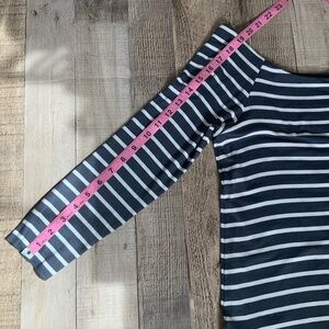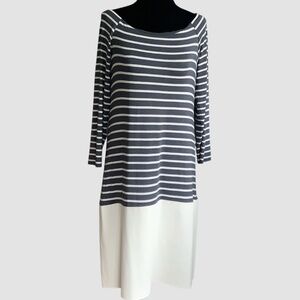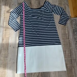 NWOT Anthropologie Bailey44 navy blue and white striped jersey shift dress with white vegan leather dropped skirt. Boat neck- rounded at back. Soft Rayon jersey fabric. Fully lined.