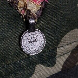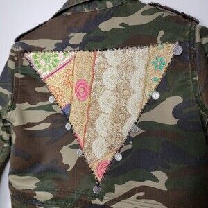 Anthropologie Beautiful Stories embroidered camouflage military jacket with drawstring waist and flap pockets.