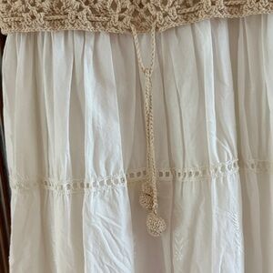 Chic dress with a beige crochet bodice and flowing white skirt. Perfect for casual wear.