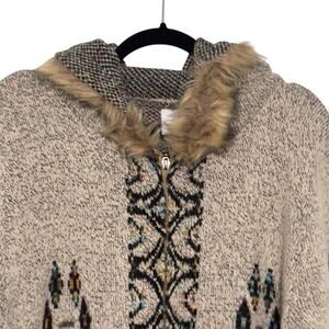 Stylish beige cardigan with intricate patterns. Features a cozy faux fur collar. Perfect for layering.