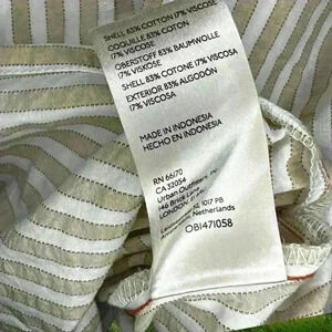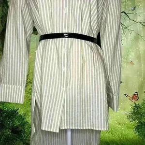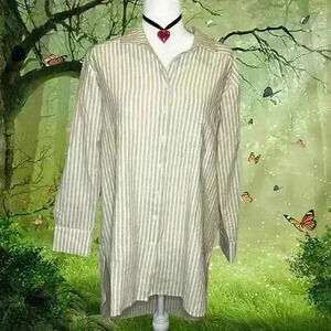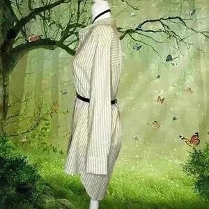 Anthropologie beige striped shirt dress with a collar, beige and white striped shirt, white button up closure, subtle red detailing, soft and comfortable material. (Belt is not included), looks very cute with a belt and leather boots. 83% cotton, 17% viscose. Brand: Anthropologie