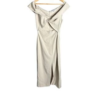 Bellevue The Label Cutout Off Shoulder Midi Dress in Off White. Size L / Large. Features off-the-shoulder neckline, front cutout, front slit, hidden back zipper closure, and midi length. Main: 88% Polyester, 12% Spandex. Lining: 96% Polyester, 4% Spandex. Fabric pilling on lining.