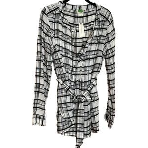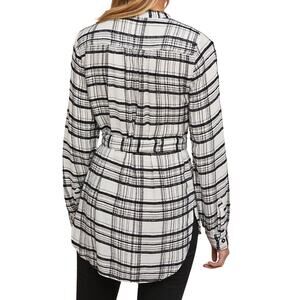 Details: Button-down tunic top with self-tie waist belt, cuffed sleeves, lightweight woven fabric, hip-length fit