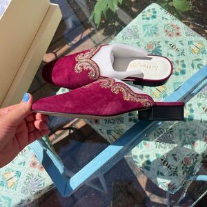 Stunning anthro Bettye muller fortune embroidered suede mules. Never been worn, in box. Genuine suede. Slip on style. Slight heel. Perfect for fall!
